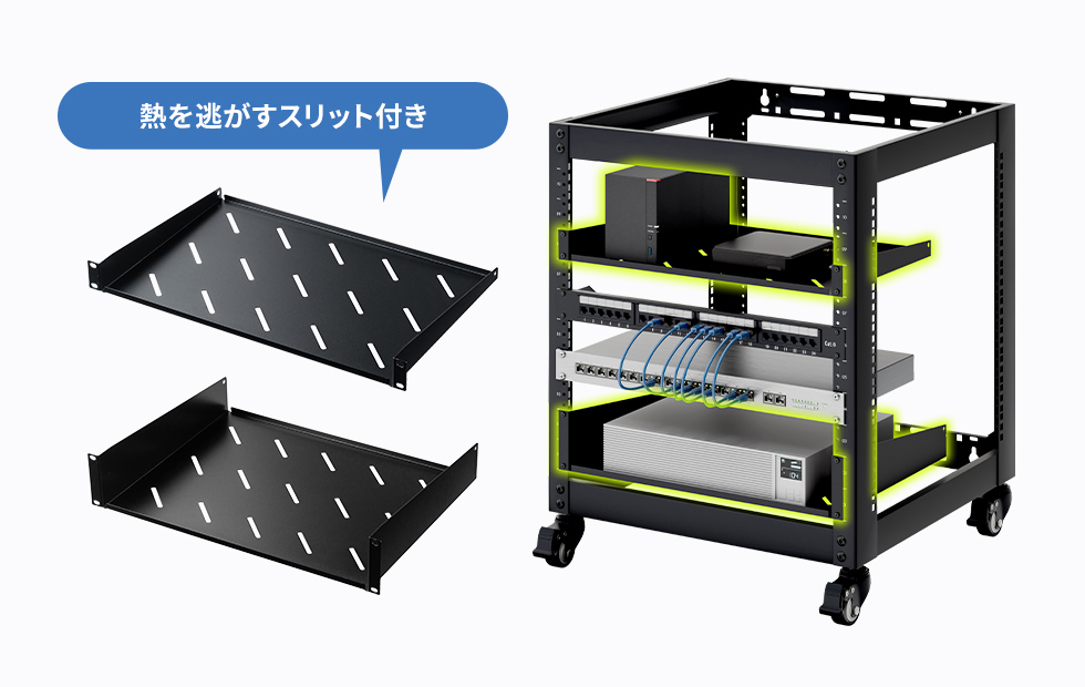 機器の熱を逃がすスリットが付いた2種類の棚板が付いています。お好みの場所に設置できます。
