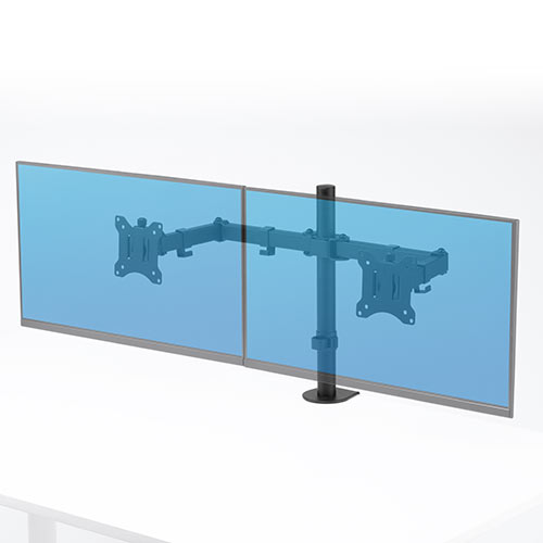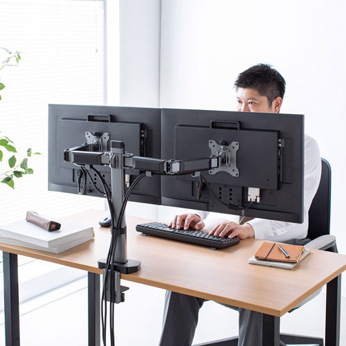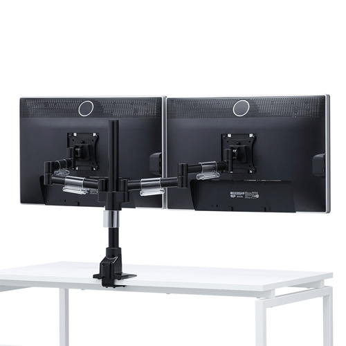 2台のディスプレイを設置でき、アーム1本につき最大9kg・32型までのディスプレイの取り付けに対応しています。デスク上のスペースを広く使いつつ、ディスプレイをベストな位置に調整することが可能です。