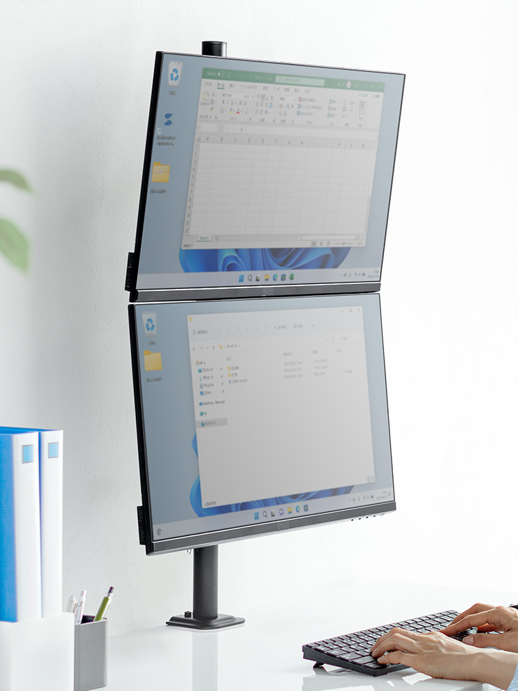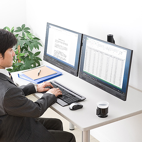 2台のディスプレイを設置できるので、ワークスペースを有効活用できます。デュアルモニターで作業効率のアップにもつながります。