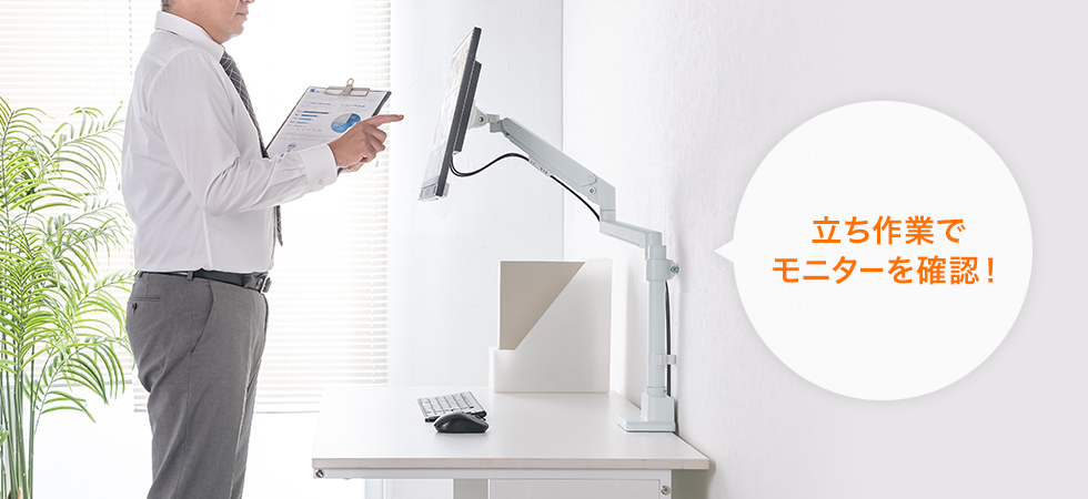 立ち作業でモニターを確認したり、ノートPCやモニターとの上下での設置のような使い方にも便利です。