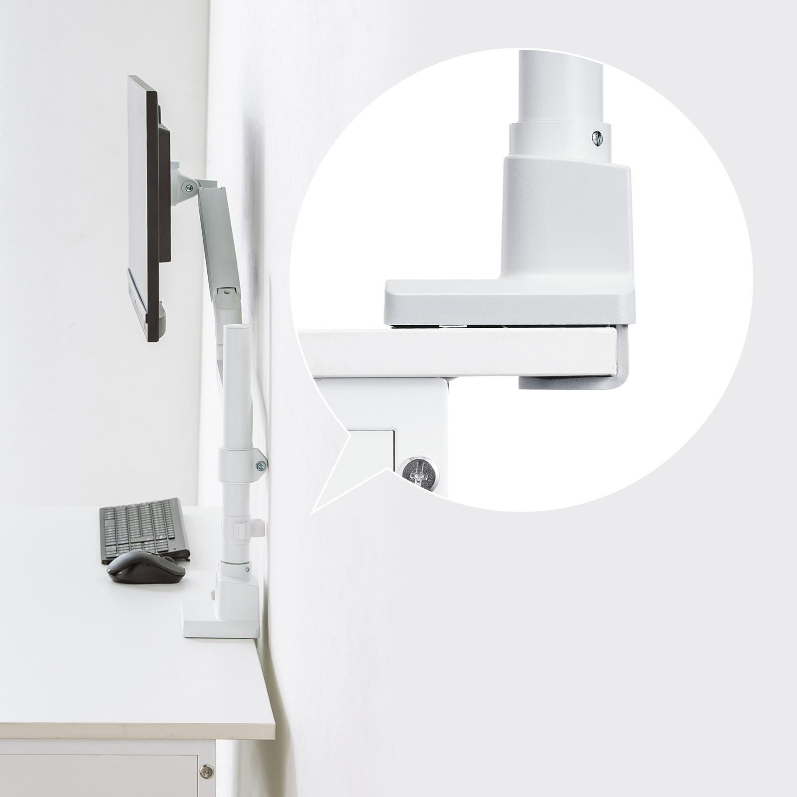 薄型クランプ採用のシングルモニターアーム。ガススプリング式アームで耐荷重1から9kg対応。 32インチまで対応。ホワイト。