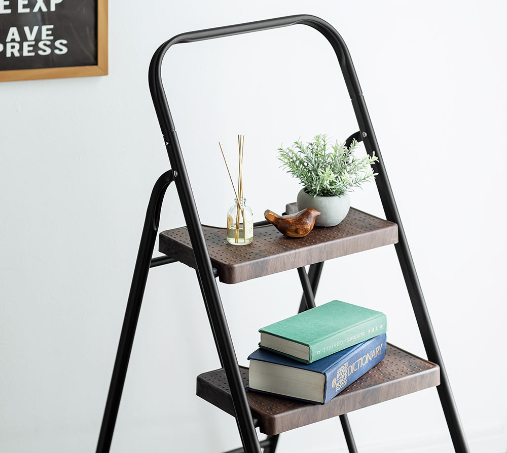 インテリアにも合わせやすい、黒フレームと木目調ステップの踏み台はいかがですか?