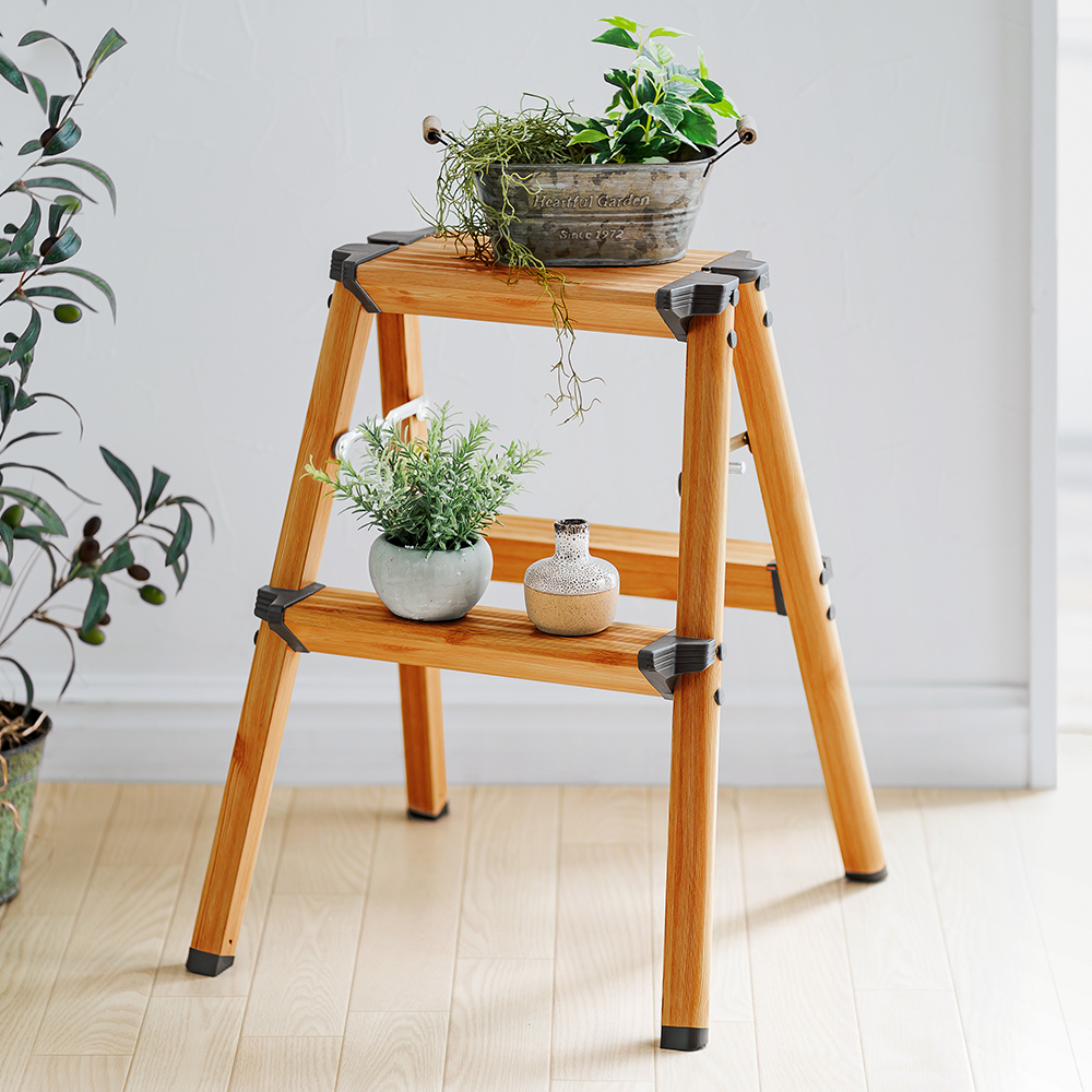 お部屋に馴染みやすい、木目調プリントの2段踏み台です。植物や小物を置いて、飾り棚のように使うのにもオススメです。