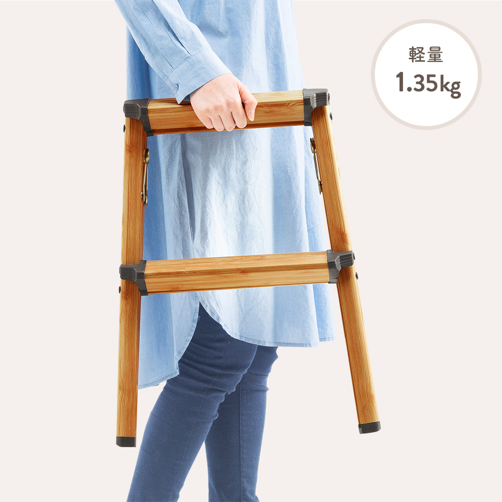 インテリアにも合わせやすい木目調プリントで、踏み台としてだけでなく飾り棚としても活用できるおしゃれな見た目です。アルミ製のフレームで軽量ながらも、耐荷重120kgであり、しっかりと体を支えてくれます。また、ステップ部分の凹凸と脚裏の樹脂カバーが滑り止めになっているので、安定して上り下りが可能です。使用していない時は、折りたたんで省スペースに収納できます。