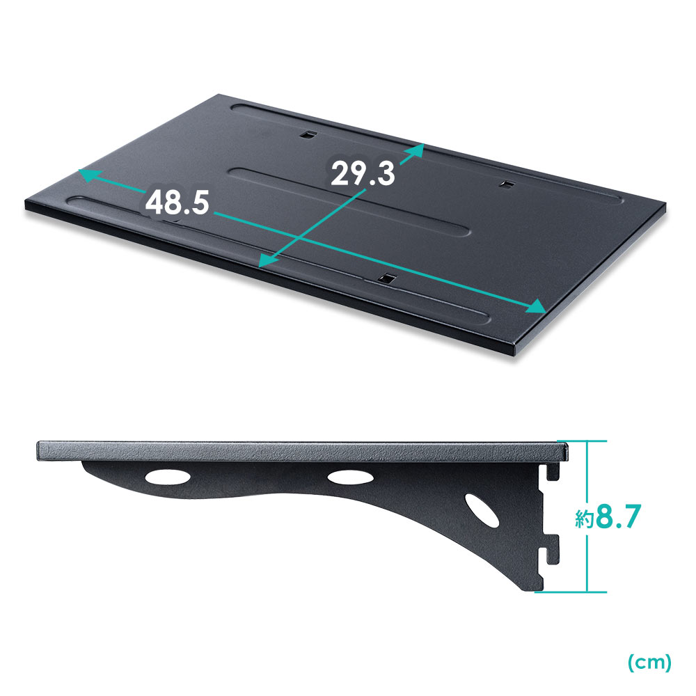 幅48.5cm、奥行き29.3cm。奥行きもあり、チューナーやブルーレイ・ディスクレコーダーなどの機器や小物を設置できます。