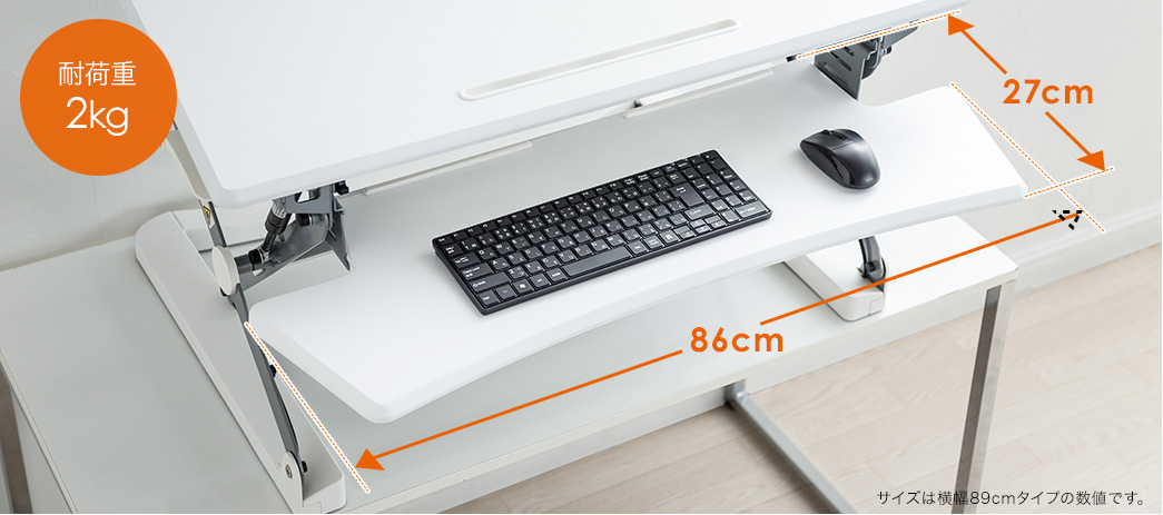 キーボード台がモニター設置面より下に付いているので、着席時も快適にキーボード操作が可能です。