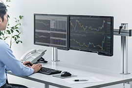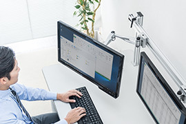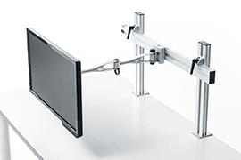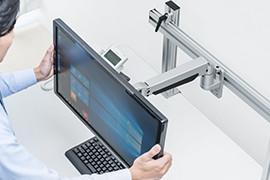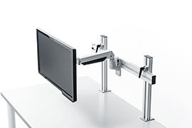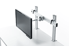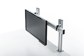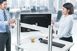 デスクにハンギングバーを取り付け、お好みのアームと組み合わせて使用できるモニ