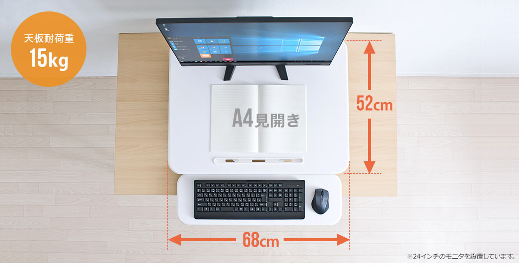 天板は横幅68cm、奥行き52cmで、モニタ1台の設置にぴったりのサイズです。