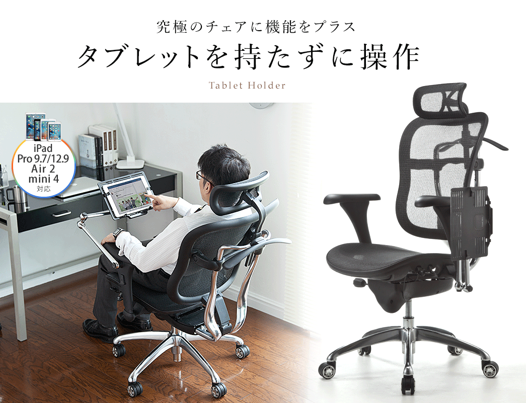 そんなお悩みを解消。手ぶらでタブレットを操作できるチェア一体型のホルダー。