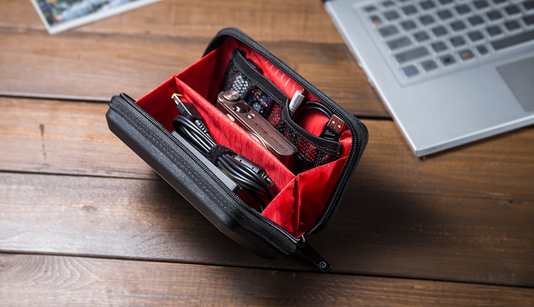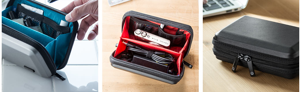 ガバッと開いて、中身が見やすく出し入れしやすいトラベルポーチです。