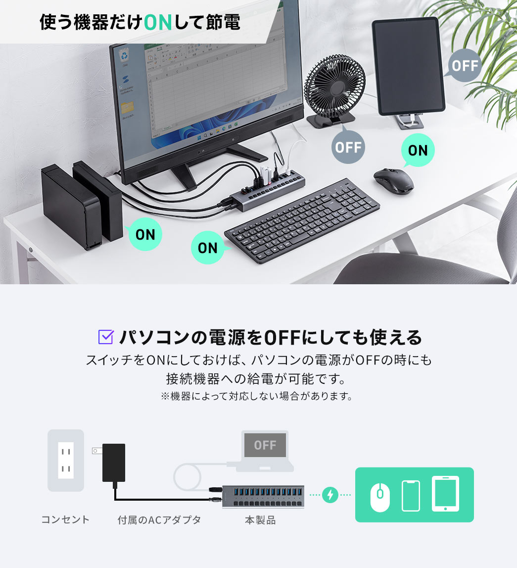 ●パソコンの電源がOFFのときでも、セルフパワー接続でスイッチをONにしておけば、接続機器への給電が可能です。