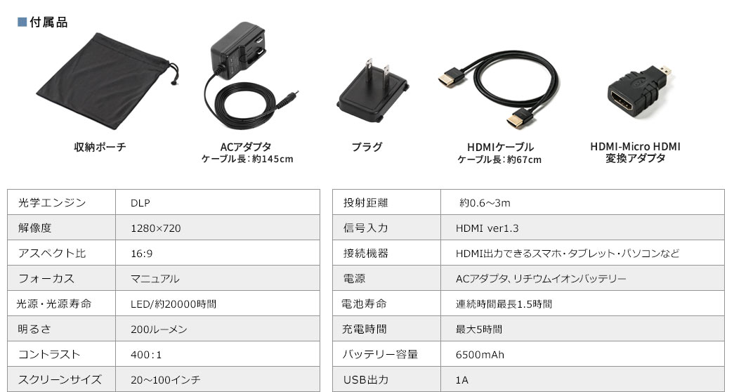 | 付属品 | ACアダプタ(ケーブル長約145cm)、プラグ、HDMIケーブル(ケーブル長約67cm)、HDMI-Micro HDMI変換アダプタ、収納ポーチ |