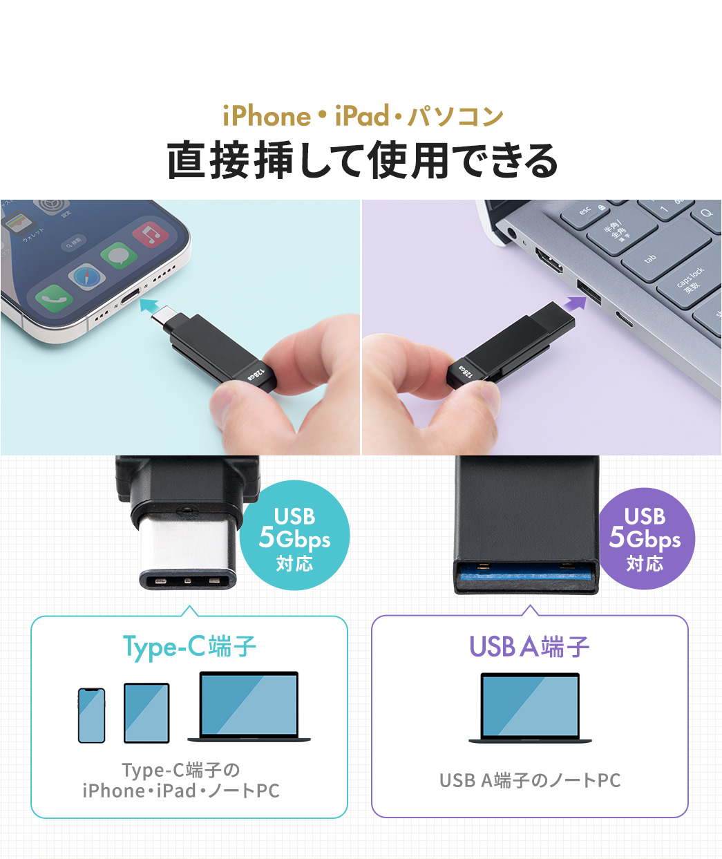 ●Type-C端子のiPhone、iPad、Androidに変換アダプタ無しで直接挿して使用することができます。