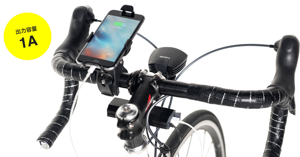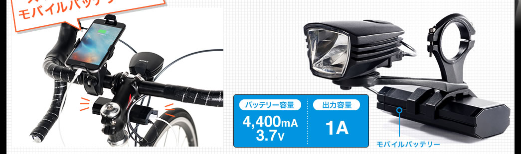 | 付属品 | LEDライト、バッテリー、ハンドル取付ブラケット一式(ハンドルシムプラスチックタイプx2 ゴムタイプx2) ※スマートフォン充電用のケーブルは付属しておりません。 |
