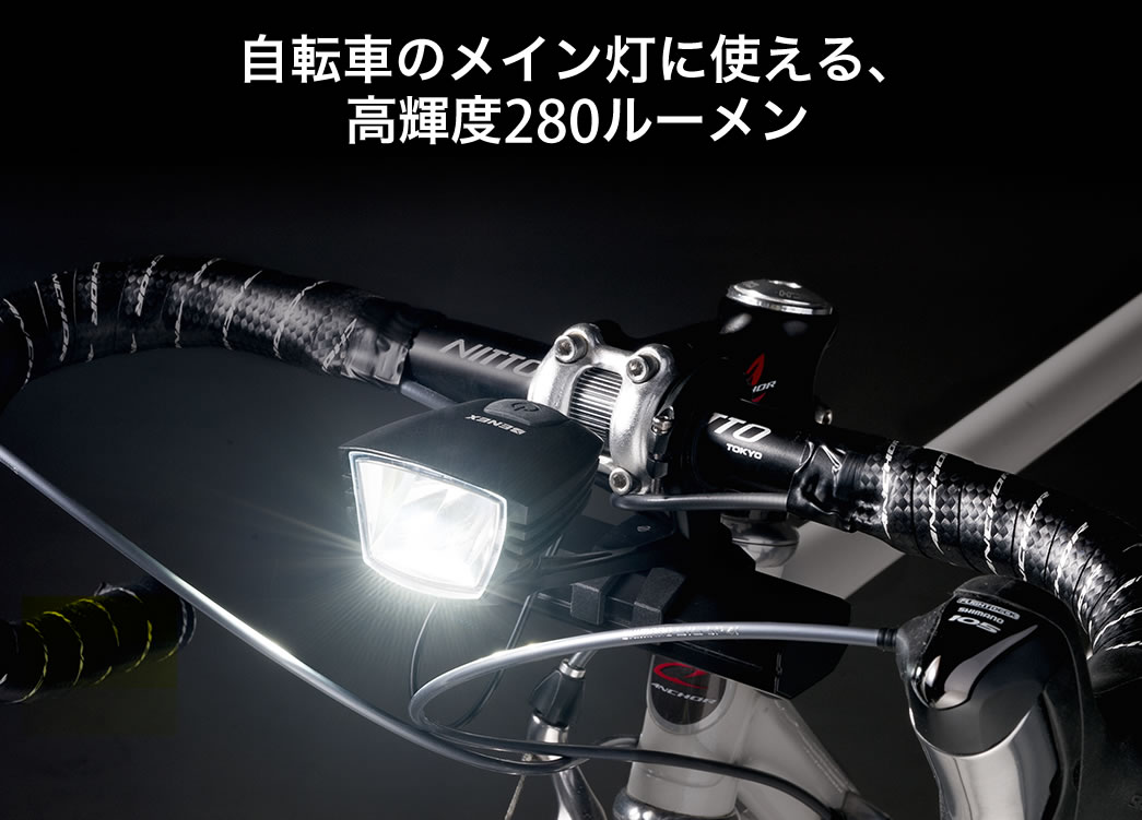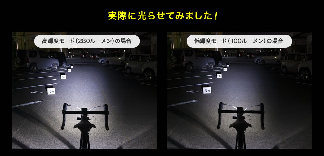 3段階の輝度があり、高輝度モードでは約150m先まで照らせる明るいLEDライトです。