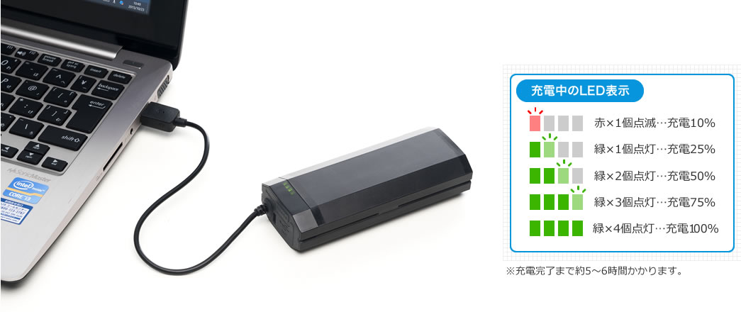 | 充電時間 | 5~6時間(ただし2A出力出来るUSB-AC使用時) |