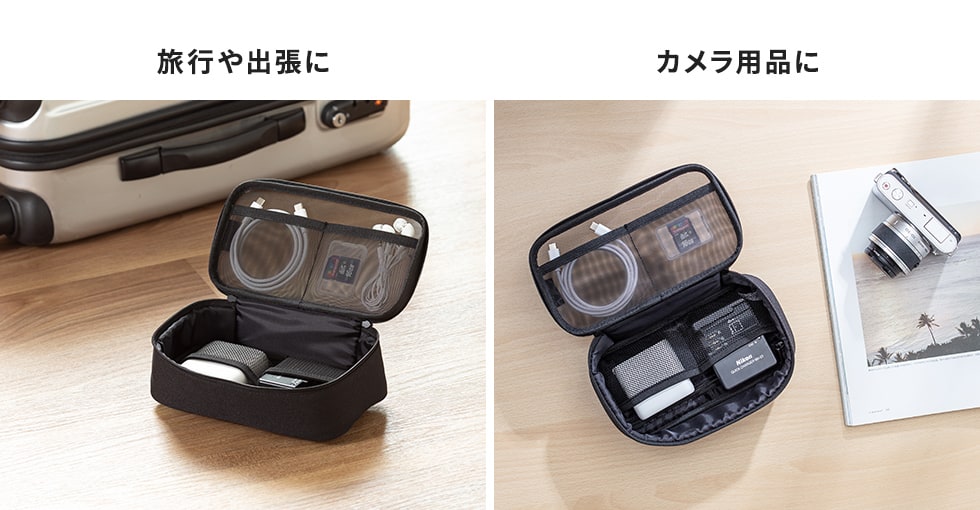 モバイルバッテリーや充電器などのアクセサリを整理収納できるガジェットケースです。