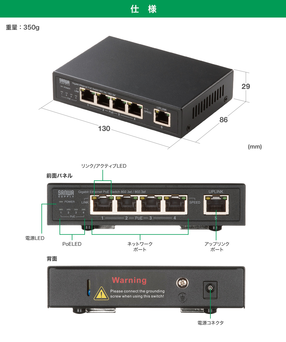 1〜4ポートは従来のPoE規格より高出力が可能な、PoE+(IEEE802.3at)規格に対応。