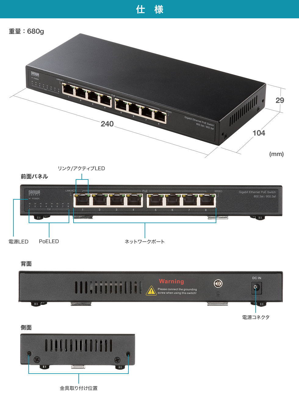 LANケーブルを用いて機器に電力を供給する、PoE対応スイッチングハブです。
