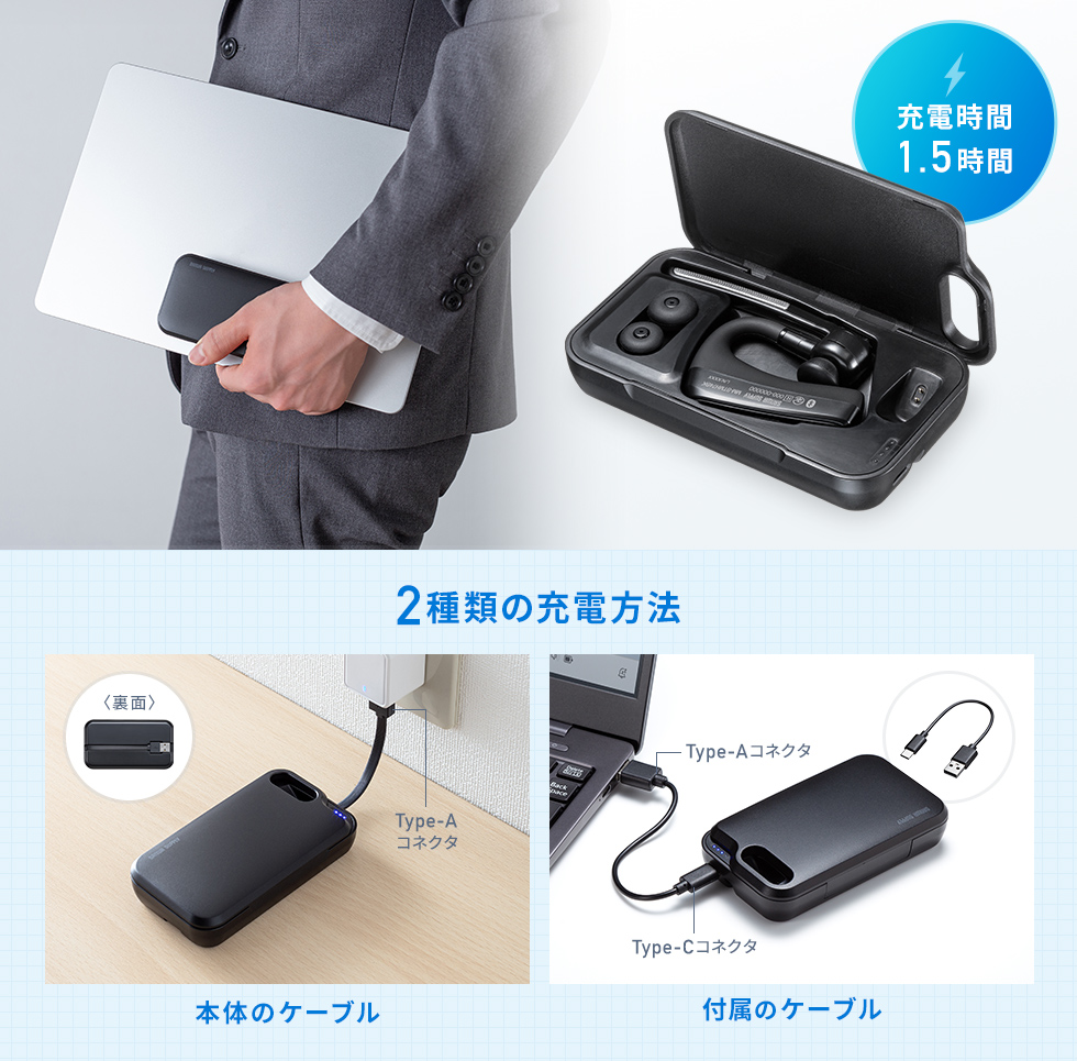 収納するだけでヘッドセットを充電可能。持ち運びながら充電をすることができます。