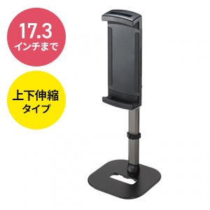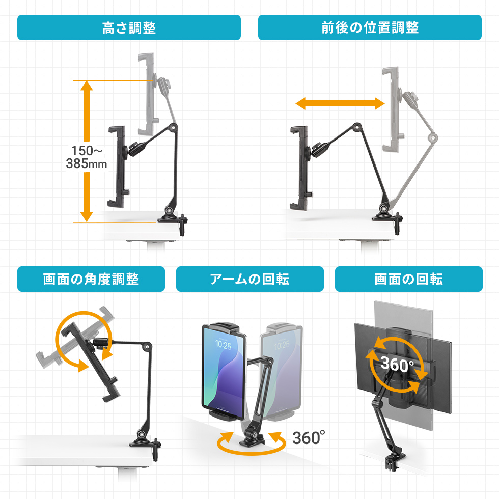 | ポイント | 角度調整と回転が出来るアームスタンド | 幅広いサイズの機種に対応 | 高さ・角度が調節でき、台座は安定感のある金属製 | タブレットを自由な位置で使える |