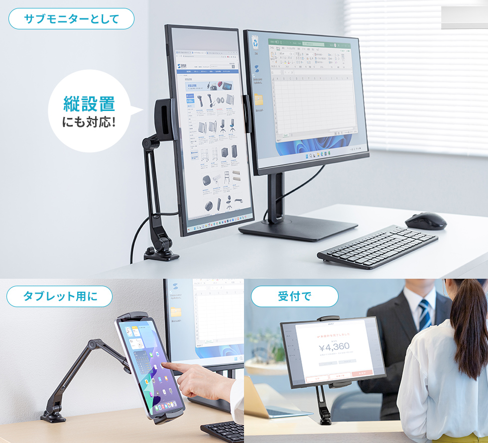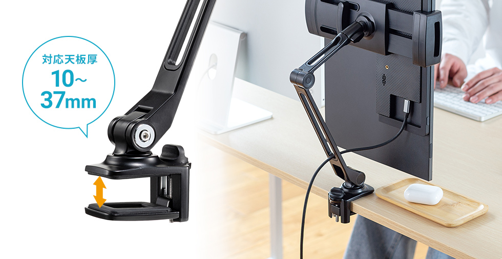 17.3インチまでのモバイルモニターやタブレットの取り付けに対応した、クランプ式のスタンドです。多関節アームによりモバイルモニターの位置を自由に調節でき、使いやすい位置にセットできます。