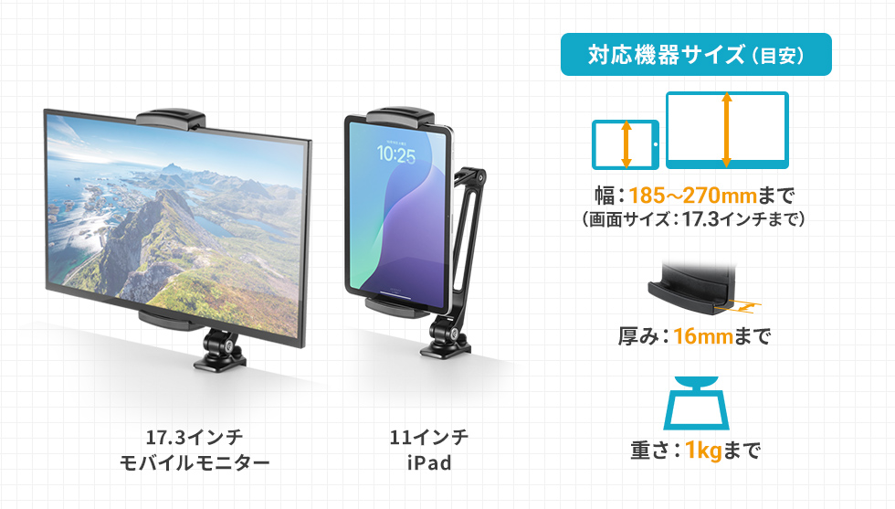 ホルダーは幅185~270mm、厚み16mm以下の機器に対応しています。17.3インチまでのモバイルモニター、タブレットなどを挟むことができます。