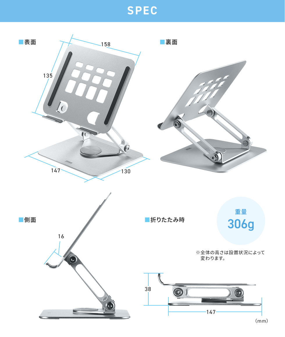 放熱効果のあるアルミ素材を使用しています。さらにタブレットの熱がこもりにくいように