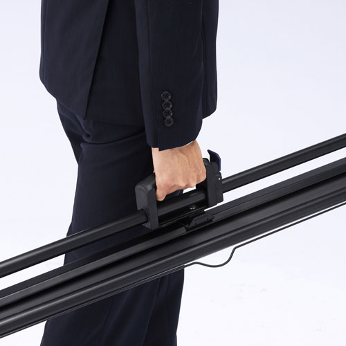 三脚を開いて、上下のストッパーを外して、スクリーンを引き出し、調節して設置完了。スクリーン比率を4:3や16:9にすることが可能です。