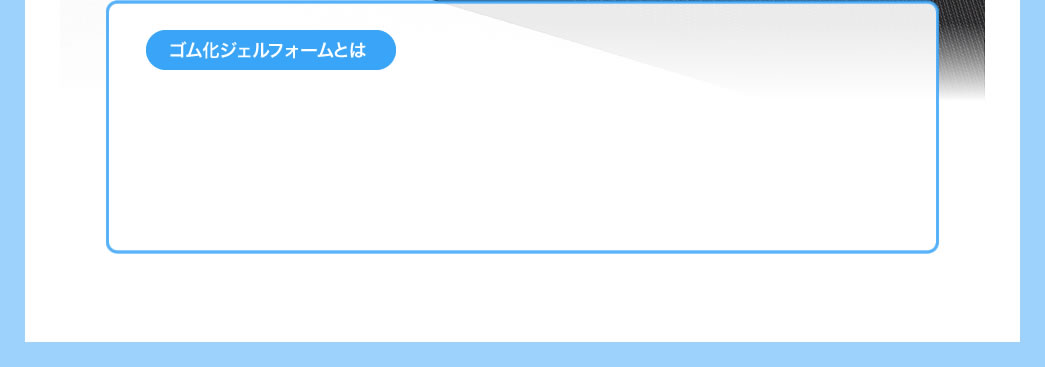 Geltec社で開発された素材です。固体PUジェル素材の持つ衝撃吸収性とソフトという持ち味の維持のため、PUジェルの元々の特性を変えてゴムの特性を付与しています。引っ張り・引き裂き強度を強化することで、「絞り」・「戻り」の変形が可能なクローズドセル構造を採用しています。この「ゴム化ジェルフォーム」素材は、固体PUジェルよりもさらに優れた滑り止め機能、軽量性があります。またクローズドセル構造なので、防水・防油特性も持ち合わせています。