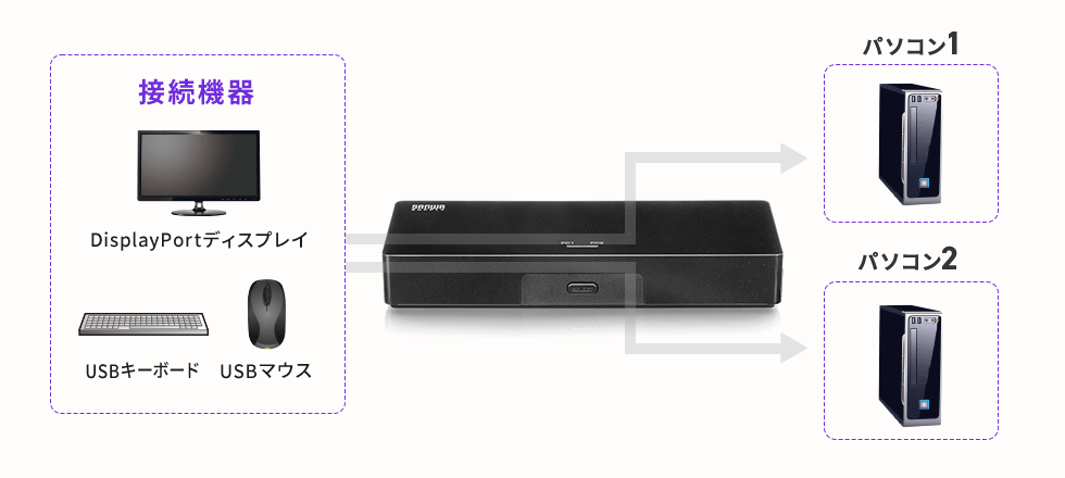 1組のDisplayPortディスプレイ・USBキーボード・USBマウスを、2台のパソコンで使用できます。