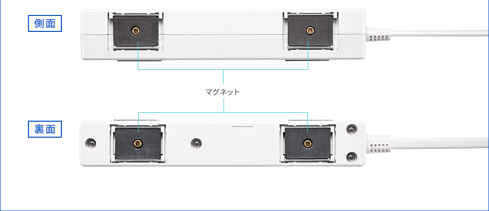 ●強力ダブルマグネット(底面、側面 計4個付き)でスチール面にしっかり固定できます。本体裏面(2個)と側面(2個)に強力なマグネットが付いているため、スチール製のキャビネットや天板の天面、側面どちらにも設置が可能です。