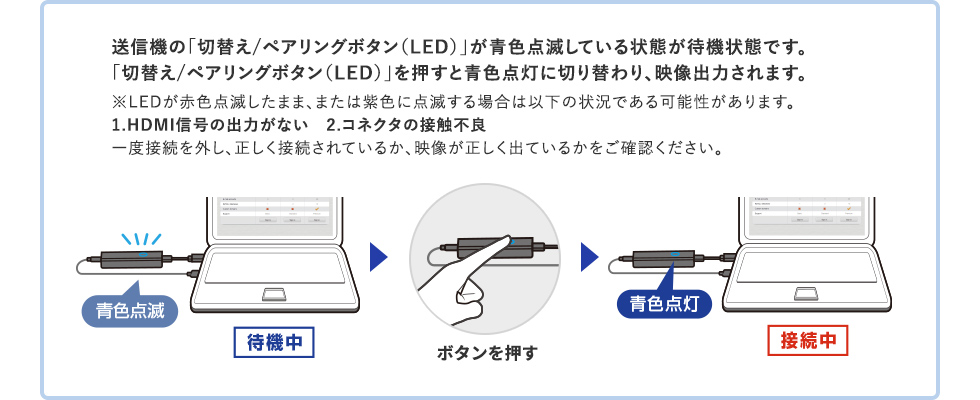 長押しした後LEDが青色点滅に変わったらペアリング完了です。