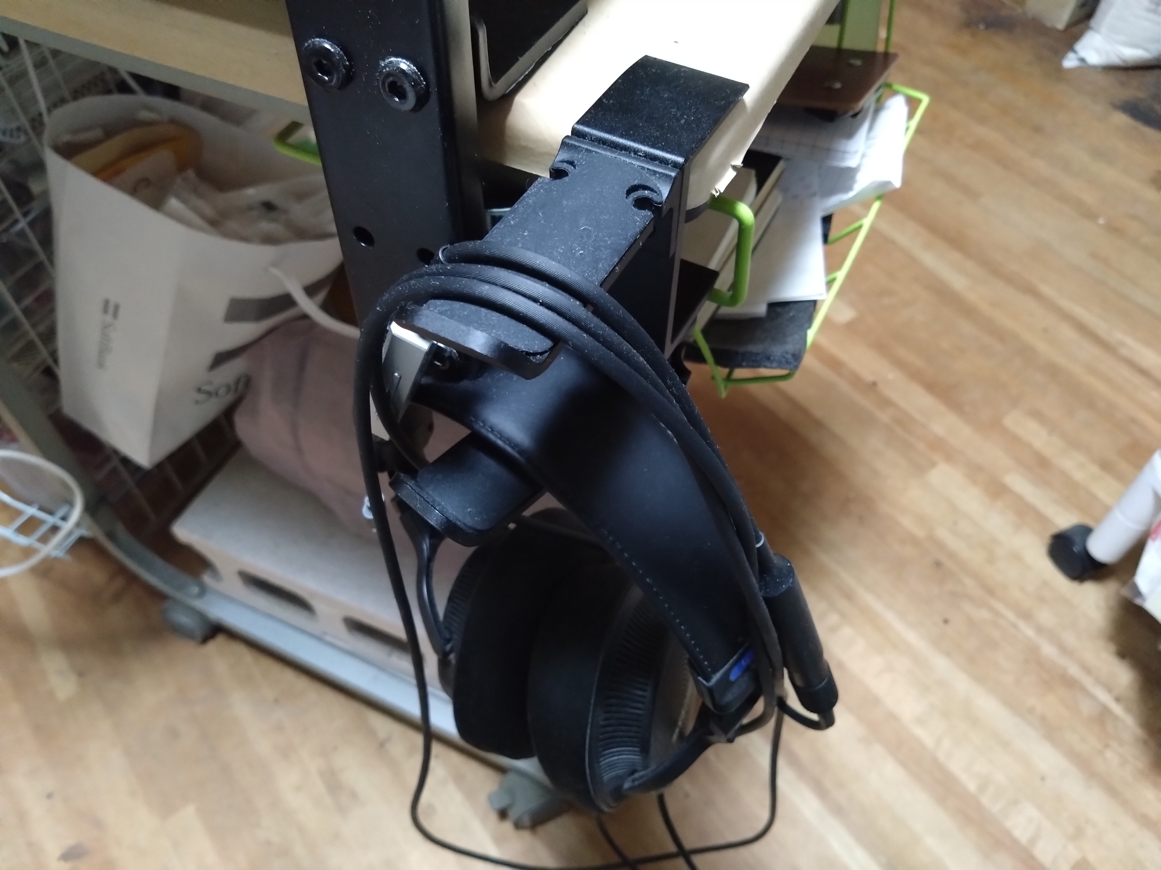 デスクのサイドの有効利用と、作りが極めてしっかりしていて、大抵のものが掛けられます。