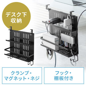 デスク下収納ラック(Mサイズ・幅27cm・2段タイプ・クランプ・マグネット・木ネジ取付け・スチール製・フック・棚板付き・ケーブルトレー・ブラック)
